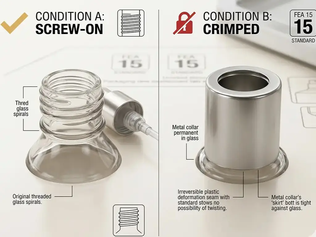 According to the structural guidelines set by the European Aerosol Federation (FEA), the ubiquitous 15mm crimp-on pump standard (FEA 15) is specifically designed to create an impenetrable vacuum seal. This industrial standard exists to prevent oxidation and tampering, meaning it was intentionally designed to be irreversible. Therefore, before you grab any tools, you must diagnose your bottle type. Follow this quick 3-step diagnostic check to find your tailored path: